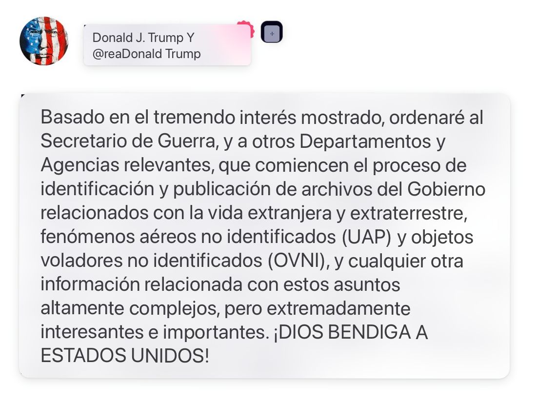 La acción involucrará al Departamento de Guerra y a otras agencias federales, y busca transparentar información que durante décadas ha generado especulación sobre fenómenos aéreos no identificados y posibles formas de vida extraterrestre, según amplió el mandatario.