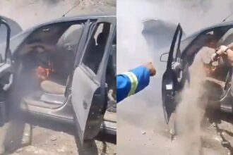 VIDEOS: Vehículo se incendió el 25May en la autopista Caracas – La Guaira, trabajadores viales usaron arena para apagarlo