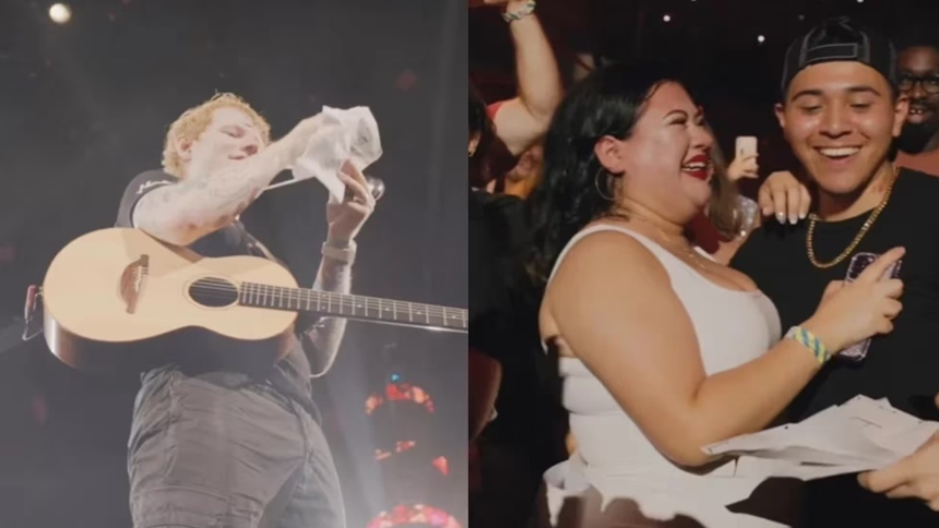 Medios estadounidenses precisaron que la pareja tenía un cartel en el que pedía que pasaran un mensaje a Ed Sheeran. Mientras el concierto transcurría en total normalidad, el cantante lo vio y aceptó su pedido.