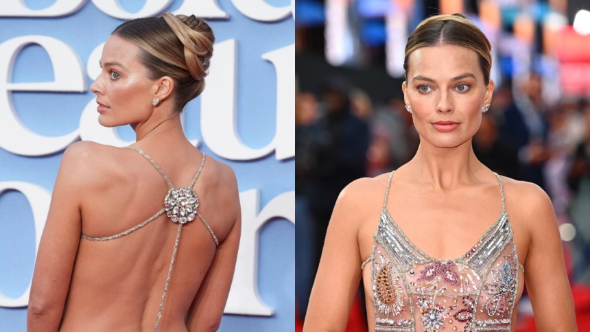 El impactante look «desnudo» de Robbie fue uno de los aspectos más comentados de la noche. Más allá de la espalda descubierta, la pieza contaba con motivos florales y de paisley, elaborados en cristales y lentejuelas.