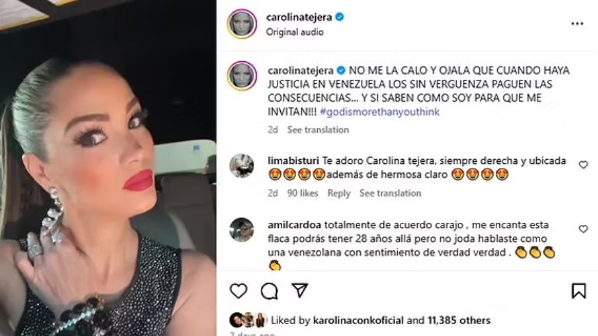 Carolina Tejera cuestionó que la exreina de belleza participara en el programa Top Chef VIP de Telemundo y luego asistiera a eventos de cine venezolano “llorando” por la crisis del país. “Primero te llenas los bolsillos y después si sales a criticar… qué hipócrita eres, y más hipócrita la gente que te apoya”, afirmó.