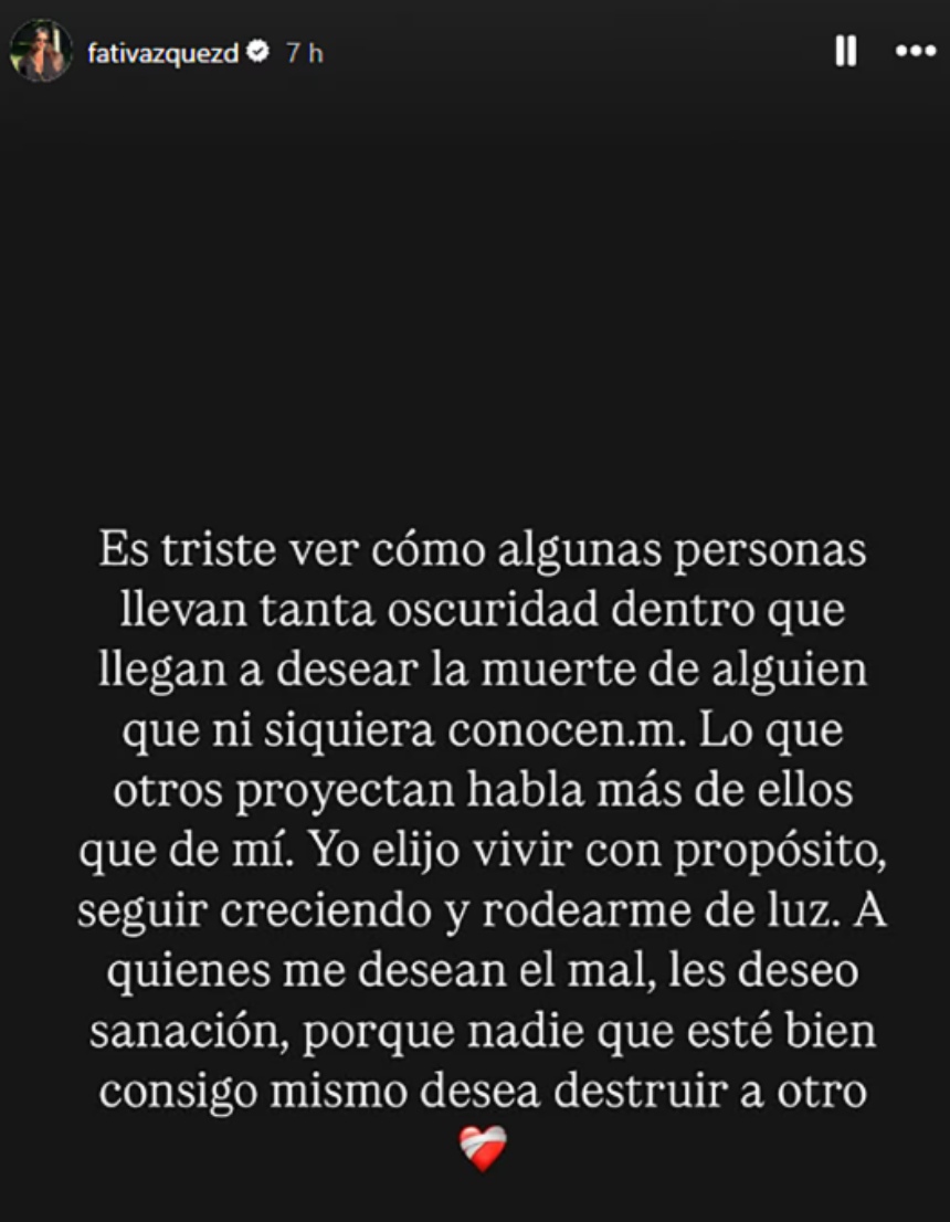 «Lo que otros proyectan, habla más de ellos que de mí. Elijo vivir con el propósito de seguir creciendo y rodeándome de luz. A quienes me desean el mal, les deseo la curación, porque nadie que esté bien consigo mismo desea la destrucción», concluyó.