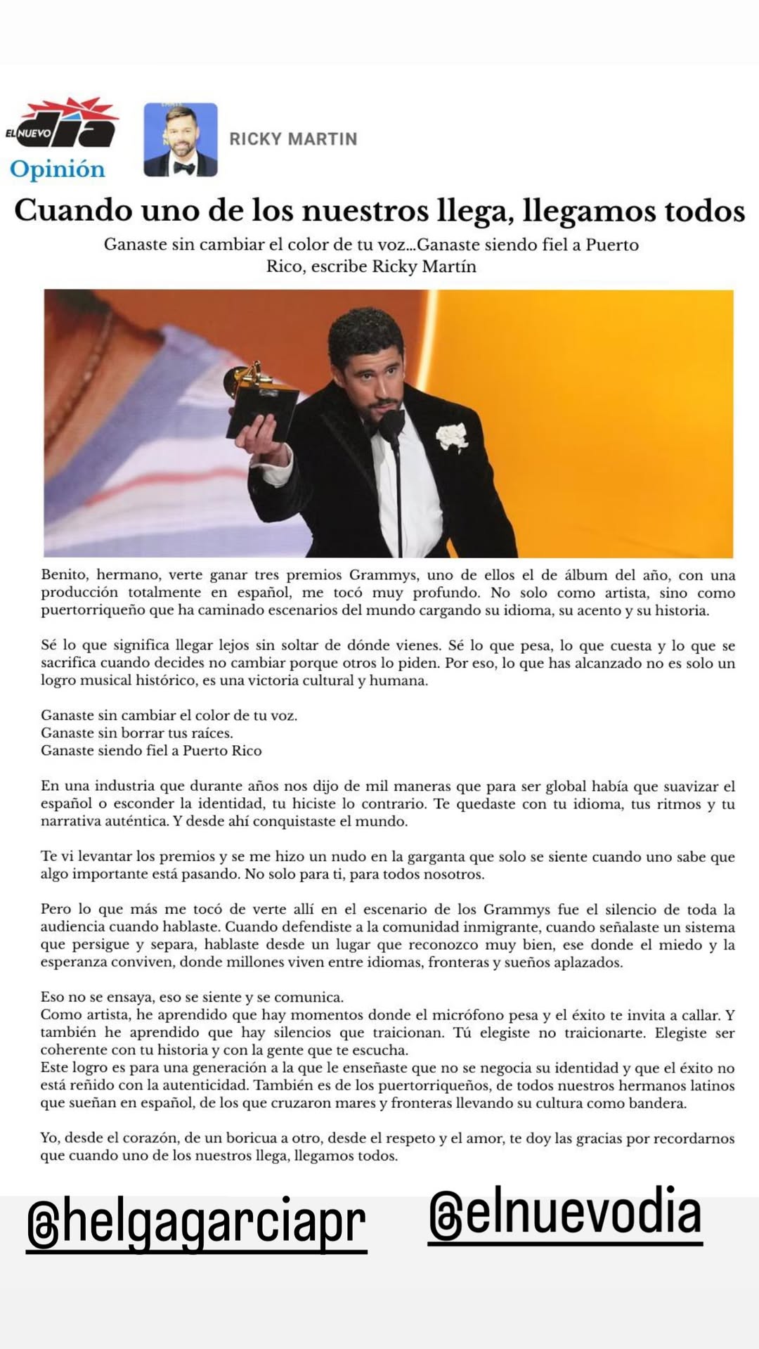 «Sé lo que significa llegar lejos sin soltar de dónde vienes. Sé lo que pesa, lo que cuesta y lo que se sacrifica cuando decides no cambiar porque otros lo piden. Por eso, lo que has alcanzado no es solo un logro musical histórico, es una victoria cultural y humana», apuntó Ricky Martin.