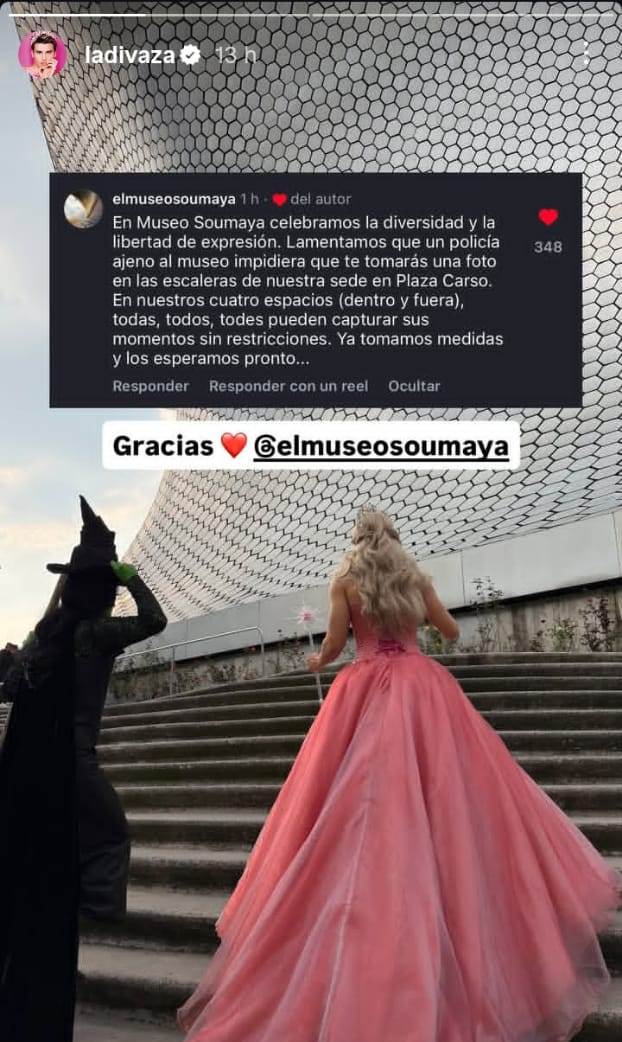 «En el Museo Soumaya celebramos la diversidad y la libertad de expresión. Lamentamos que un policía ajeno al museo impidiera que te tomaras una foto en las escaleras de nuestra sede en Plaza Carso. En nuestros cuatro espacios (dentro y fuera), todas, todos, todes pueden capturar sus momentos sin restricciones. Ya tomamos medidas y los esperamos pronto», expresó.