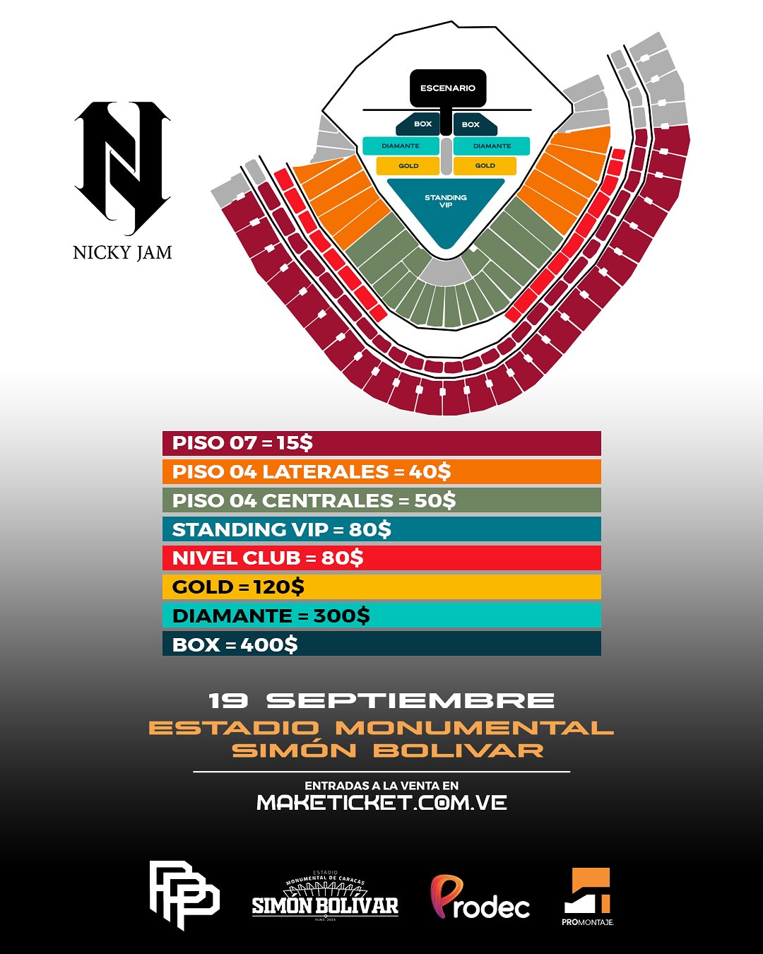 Los precios de las entradas para disfrutar del concierto de Nicky Jam van desde los 15 dólares, la más económica, hasta 400 dólares, la más costosa. De acuerdo a la imagen publicada por la productora, esto forma parte de la primera preventa.