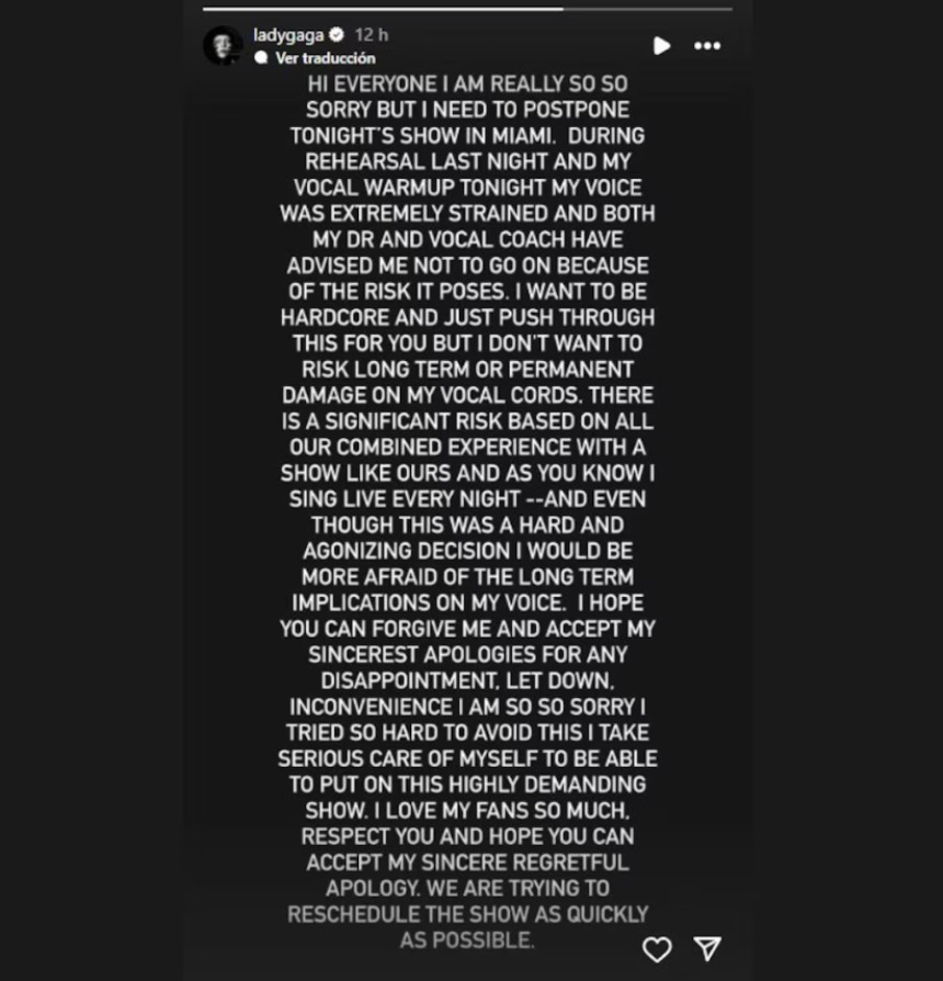 «Quisiera ser fuerte y seguir con esto por ustedes, pero no quiero arriesgarme a dañar mis cuerdas vocales de manera permanente», aclaró Lady Gaga. «Temería más las consecuencias a largo plazo para mi voz», acotó.