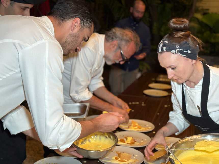 Junto a un grupo de cocineros venezolanos y otros que le acompañaron desde Italia, el hombre nacido en Módena en 1962, deleitó a los asistentes con un menú que incluyó ternera, láminas de pasta tricolor, puré de patatas, un arroz con infusión cítrica y el infaltable Parmigiano Reggiano, pero sobre todo puso de manifiesto mucha creatividad, sapiencia y una técnica impecable.