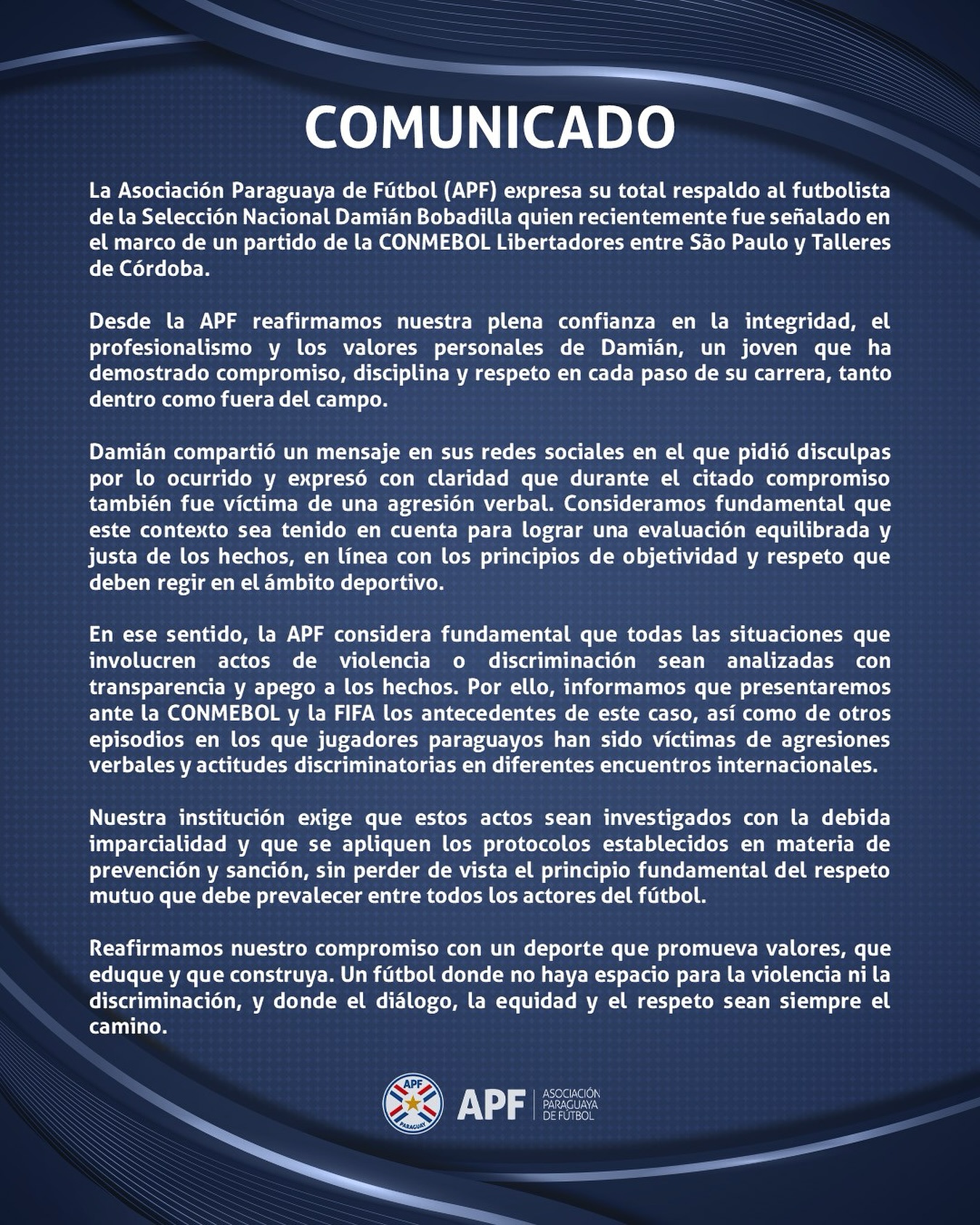 «Reafirmamos nuestra plena confianza en la integridad, el profesionalismo y los valores personales de Damián. Un joven que ha demostrado compromiso, disciplina y respeto en cada paso de su carrera, tanto dentro como fuera del campo», indicó la APF.