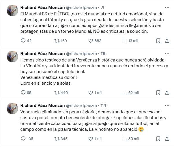 «Venezuela eliminada sin pena ni gloria, demostrando que el proceso se sostuvo por el formato benevolente de otorgar siete opciones clasificatorias y una ineficiente capacidad para jugar al juego que se llama fútbol, en el campo como en la pizarra técnica», acotó en sus redes.