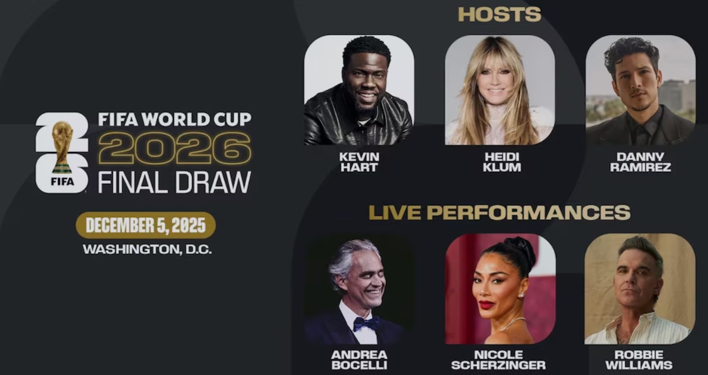 Por otra parte, la FIFA confirmó que el sorteo del Mundial contará con actuaciones en vivo de artistas de renombre internacional. Se trata de Andrea Bocelli, una de las voces más aclamadas de la historia, Robbie Williams y Nicole Scherzinger.
