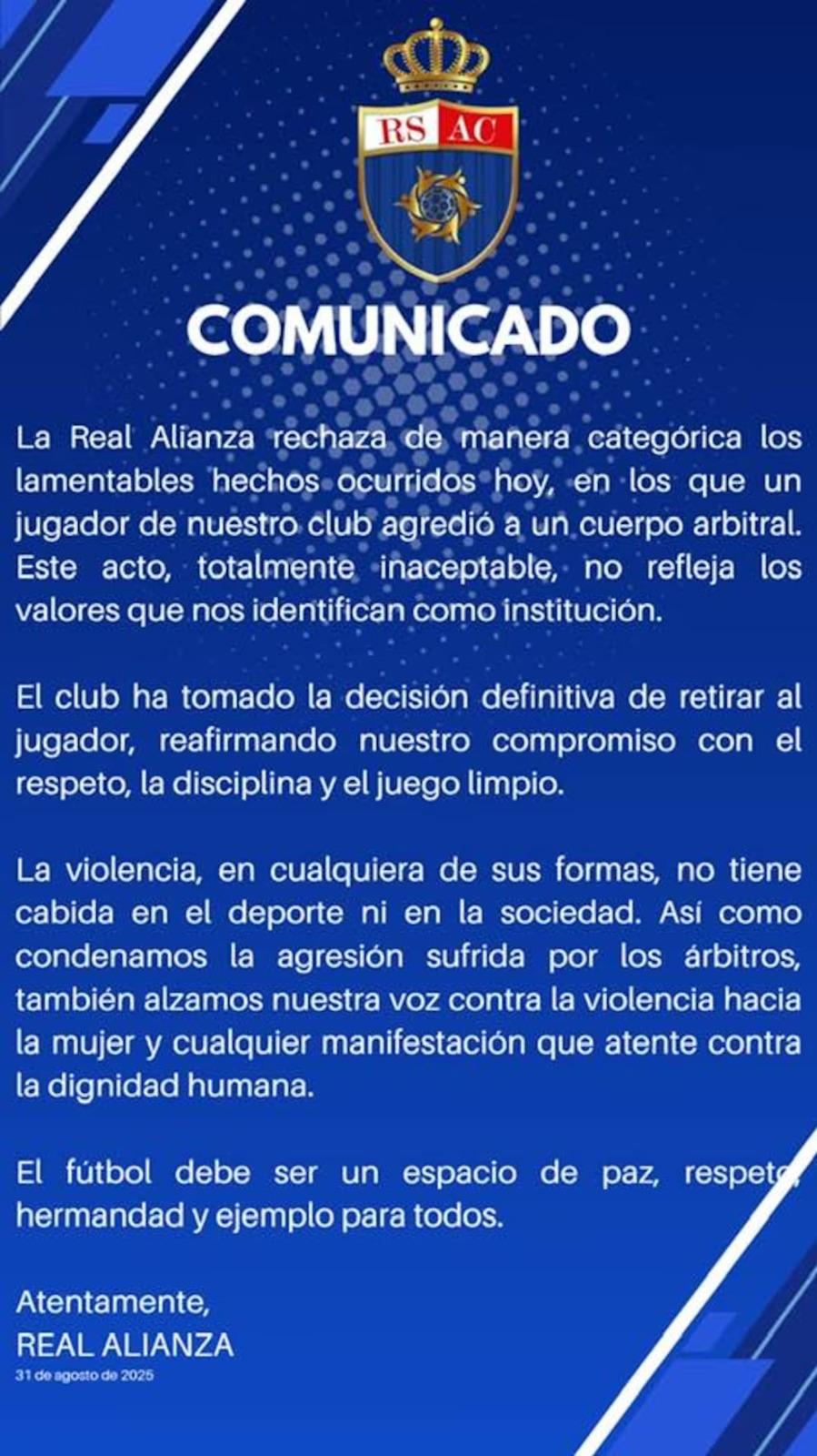 Por su parte, el Real Alianza Cataquera anunció que el jugador ya no formará parte del equipo. «El club ha tomado la decisión definitiva de retirar al jugador, reafirmando nuestro compromiso con el respeto, la disciplina y el juego limpio», indicó en un comunicado.