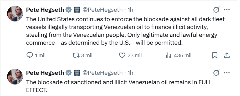 El secretario de guerra de Estados Unidos, Pete Hegseth, señaló este miércoles que el gobierno de Donald Trump seguirá con el bloqueo a busques que transporten ilegalmente el petróleo de Venezuela.
