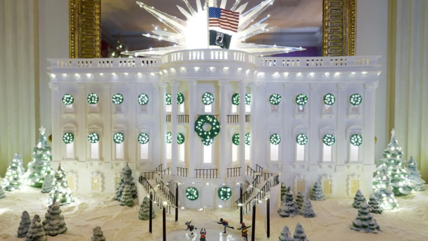 Finalmente, en el Comedor de Estado, una explosión de estrellas hechas de azúcar brilla sobre una enorme Casa Blanca de jengibre, que incluye los terrenos del sur cubiertos de nieve y docenas de mini árboles de Navidad parpadeantes.