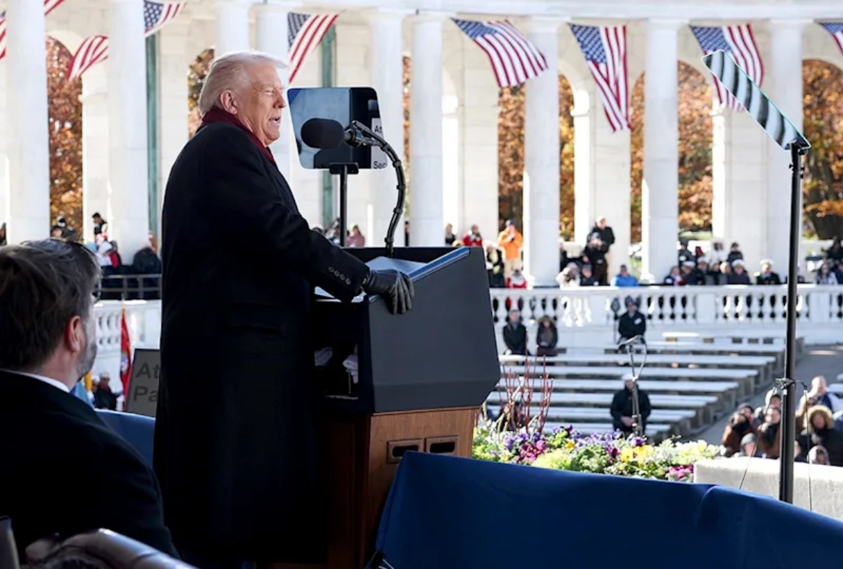 Durante su mensaje en Arlington, en el Día de los Veteranos, Trump se dirigió al presidente de la Cámara de Representantes, Mike Johnson, para destacar el logro republicano.