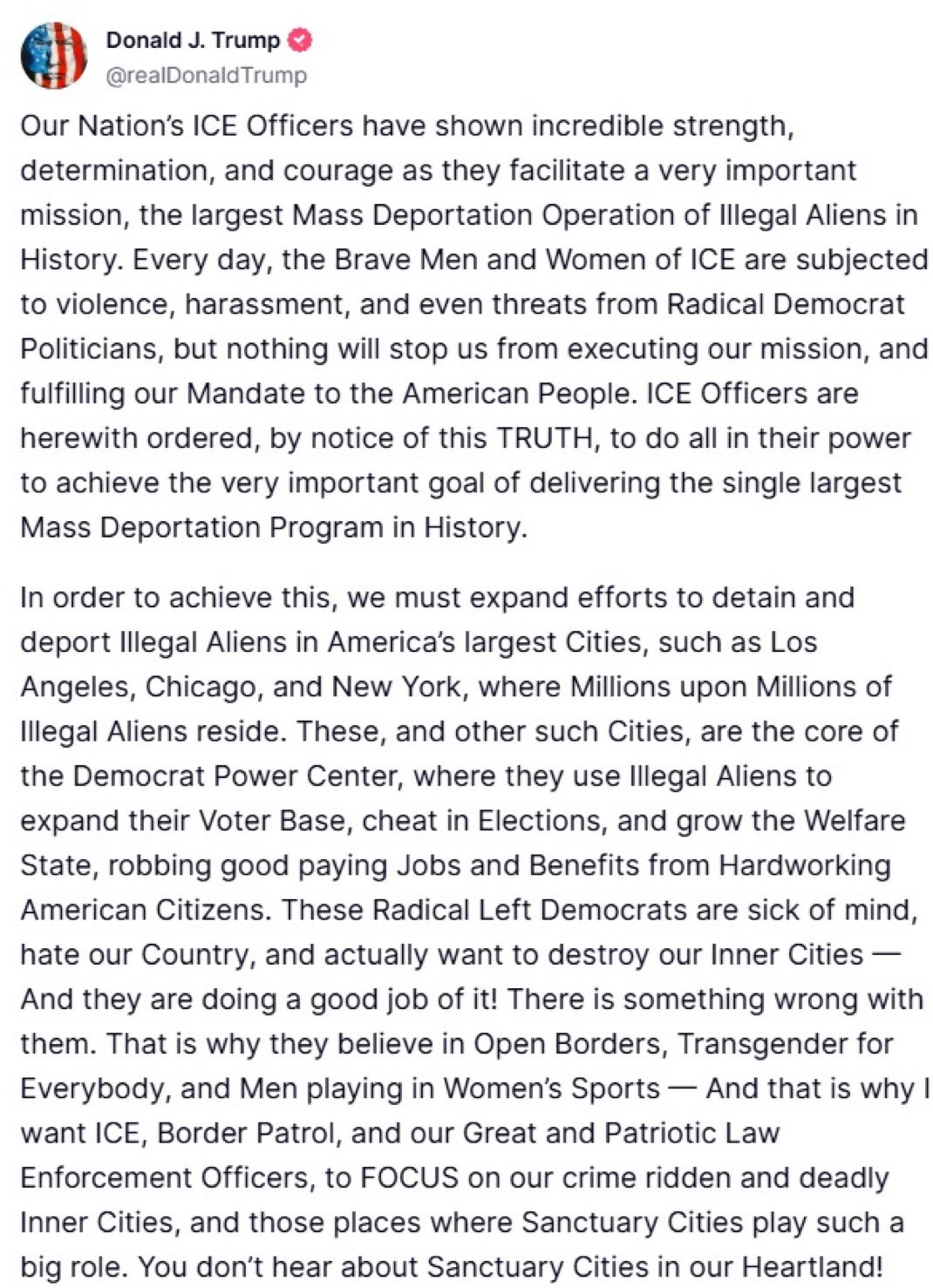 «Y por eso quieren que ICE, la Patrulla Fronteriza y nuestros grandes y patrióticos agentes del orden se concentren en nuestros barrios marginales asolados por el crimen y la muerte, y en aquellos lugares donde las ciudades santuario juegan un papel tan importante. ¡No se oye hablar de ciudades santuario en nuestro corazón!», concluyó Trump
