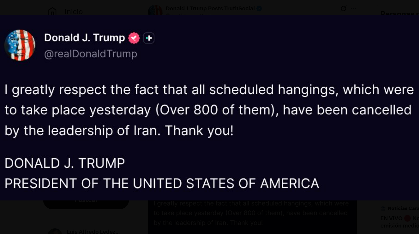 “Respeto enormemente que todos los ahorcamientos programados, que debían tener lugar ayer (más de 800), hayan sido cancelados por los líderes iraníes. ¡Gracias!”, escribió Trump en su red social Truth.