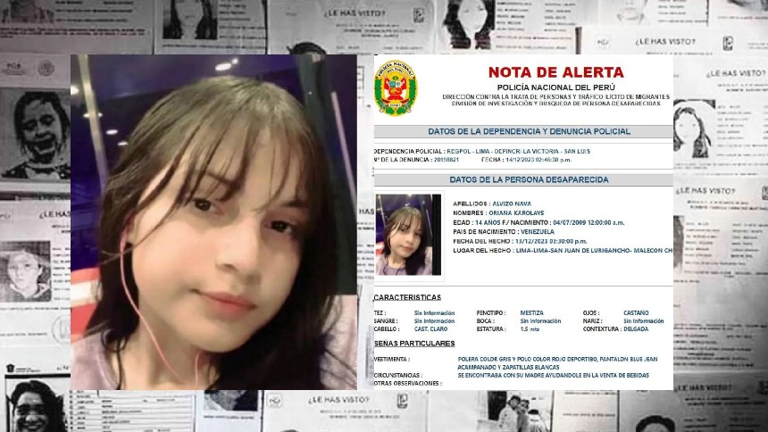 Oriana Karolaya Alvizo Nava, una adolescente venezolana de 14 años edad en Perú, está desaparecida desde hace casi un mes después que el pasado 13 de diciembre, a eso de la 1:30 pm hora local, fuera vista por última vez mientras trabajaba vendiendo helados en el Malecón Checa del distrito de San Juan de Lurigancho, Lima, por lo que vecinos y autoridades están en su búsqueda.