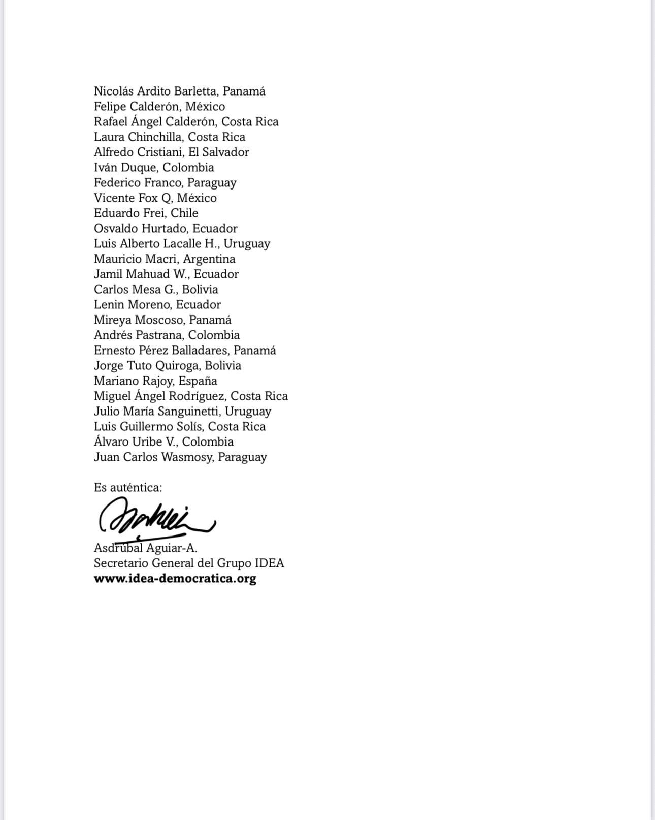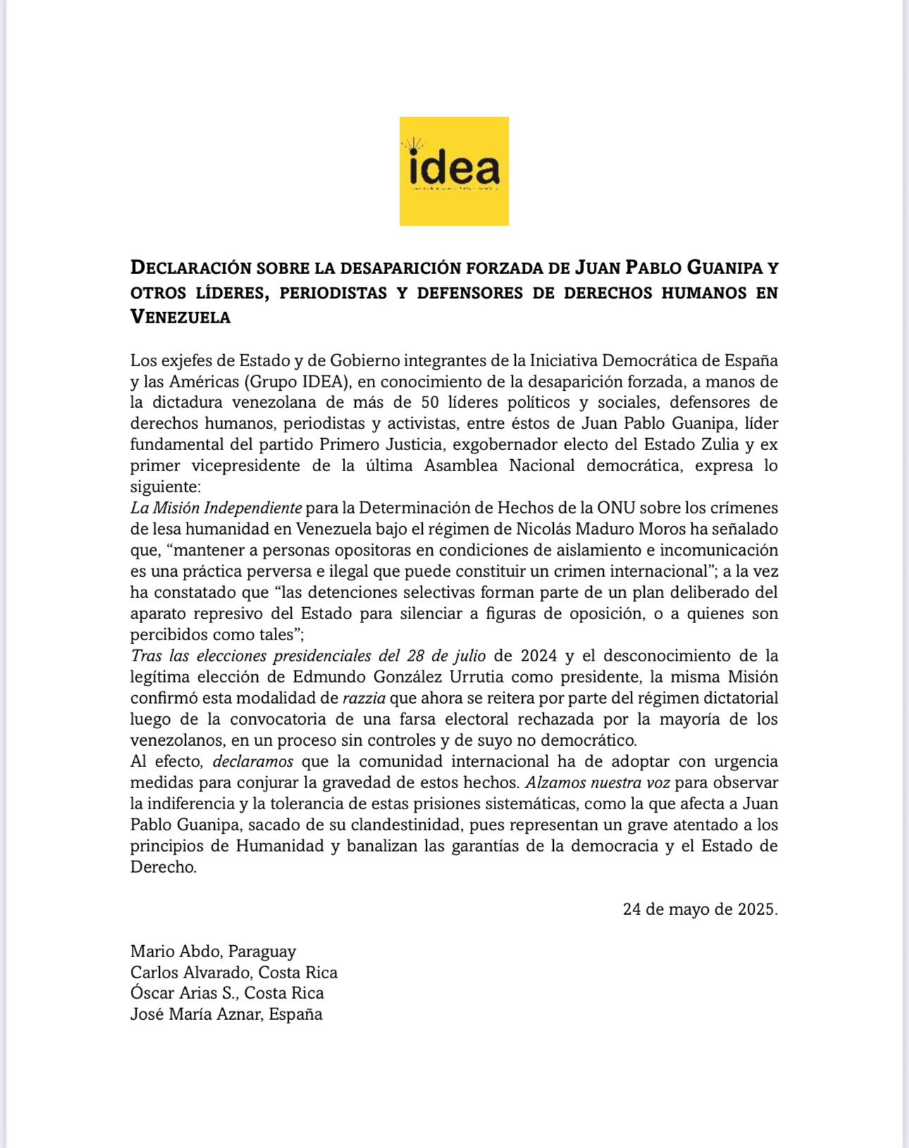 29 ex jefes de Estado, miembros de la Iniciativa Democrática de España y las Américas (Grupo Idea), condenaron las «detenciones selectivas» en Venezuela tras las «desapariciones» de más de 50 líderes, entre ellos periodistas y defensores de los Derechos Humanos, donde destaca la presencia del exdiputado Juan Pablo Guanipa.