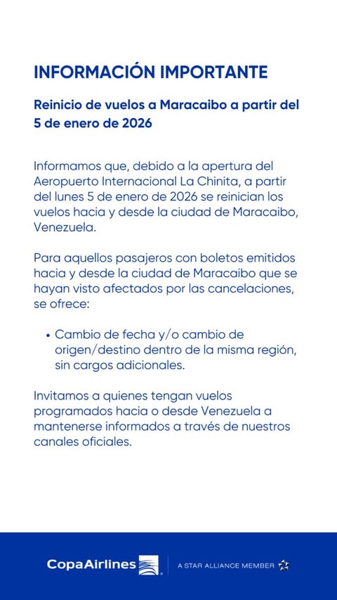 «Para aquellos pasajeros con boletos emitidos hacia y desde la ciudad de Maracaibo que se hayan visto afectados por las cancelaciones, Copa Airlines ofrece cambio de fecha y/o cambio de origen/destino dentro de la misma región, sin cargos adicionales», agregó.