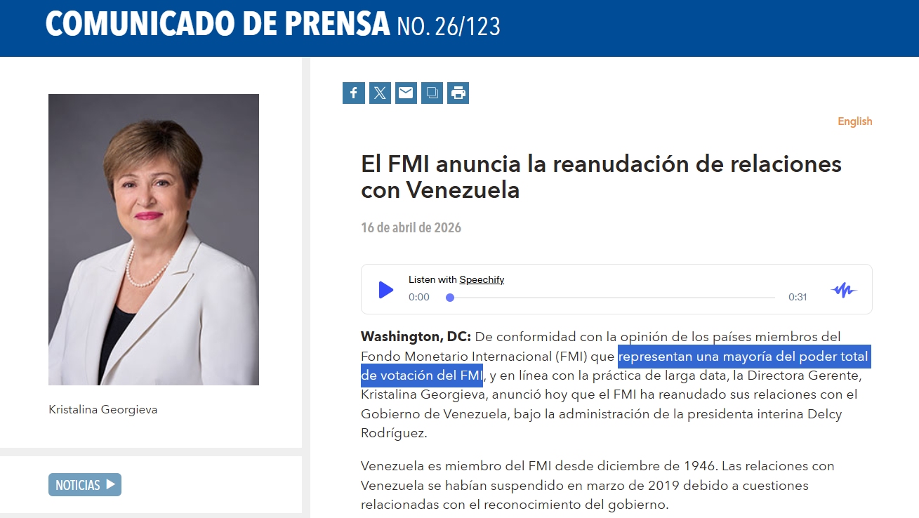 El Fondo Monetario Internacional (FMI) anunció este jueves la reanudación de relaciones con Venezuela, luego de consultar a sus Estados miembros sobre el reconocimiento al gobierno de Delcy Rodríguez.