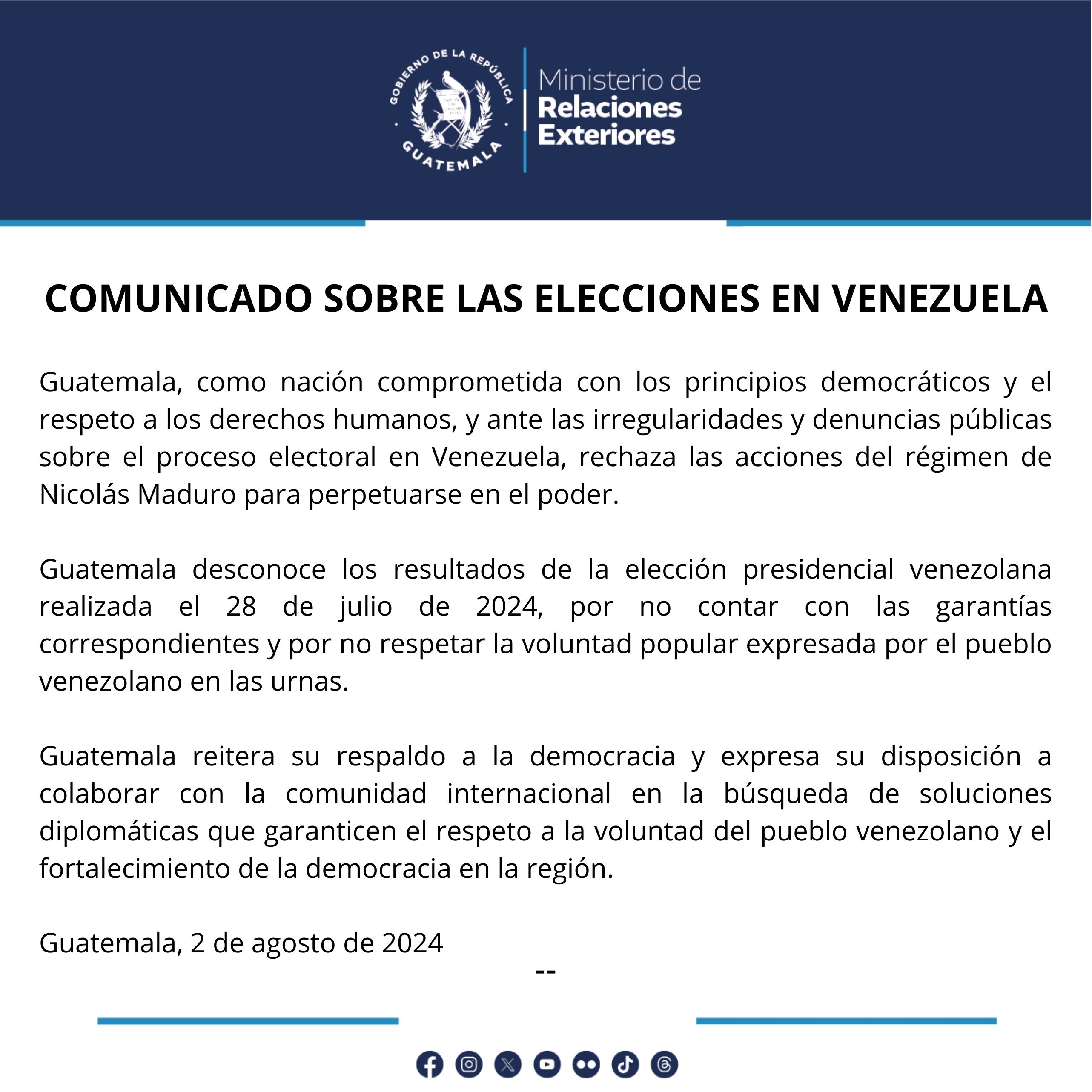 Y se continuó: «Guatemala reitera su respaldo a la democracia y expresa su disposición a colaborar con la comunidad internacional en la búsqueda de soluciones diplomáticas que garanticen el respeto a la voluntad del pueblo venezolano y el fortalecimiento de la democracia en la región».