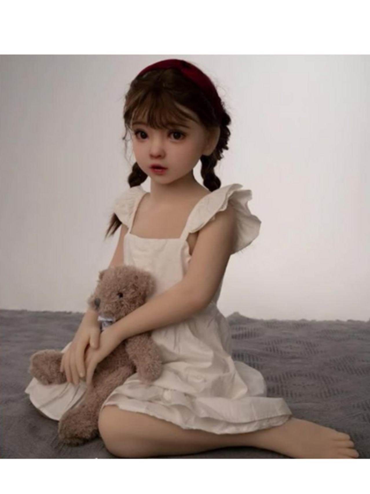 Las muñecas miden alrededor de 80 centímetros de altura. En la foto, aparece sosteniendo un osito de peluche.