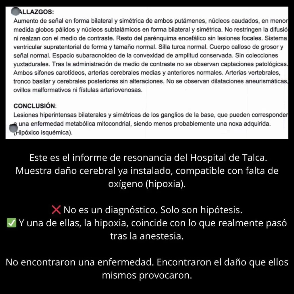 Giovanna tuvo la operación en julio de 2024 en la Clínica FUSAT de Rancagua. Tras la cirugía, la niña presentó síntomas de ataxia (pérdida de coordinación) y fue hospitalizada. En busca de un diagnóstico, se le realizaron varios exámenes, incluyendo una punción lumbar y un escáner, todos sin resultados concluyentes. Sin embargo, los médicos sospechaban de una posible infección postoperatoria o un tumor y decidieron realizar una resonancia magnética bajo sedación en el Hospital de Talca.