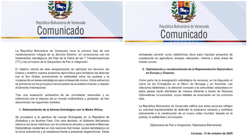 La Cancillería venezolana no solo ordenó el cierre de la Embajada en Noruega, sino también la de Australia. En cambio, abrirá sedes diplomáticas en dos países africanos: Burkina Faso y Zimbabue.
