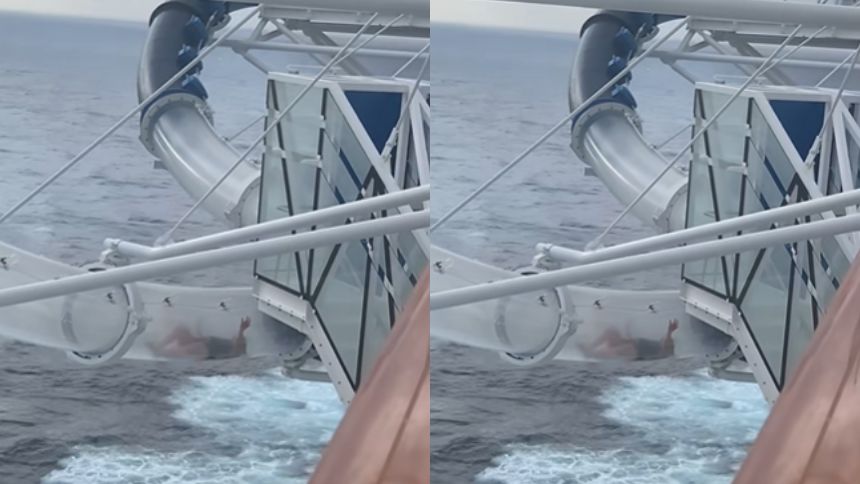 En los 13 segundos del video se ve a una visitante no identificada deslizarse por el tobogán transparente Ocean Loops, hasta quedar atorada en la sección que sobresale del costado del barco, suspendida a 48 metros sobre el mar. “¡Dios mío, está literalmente atrapada!”, se escucha en el fondo.