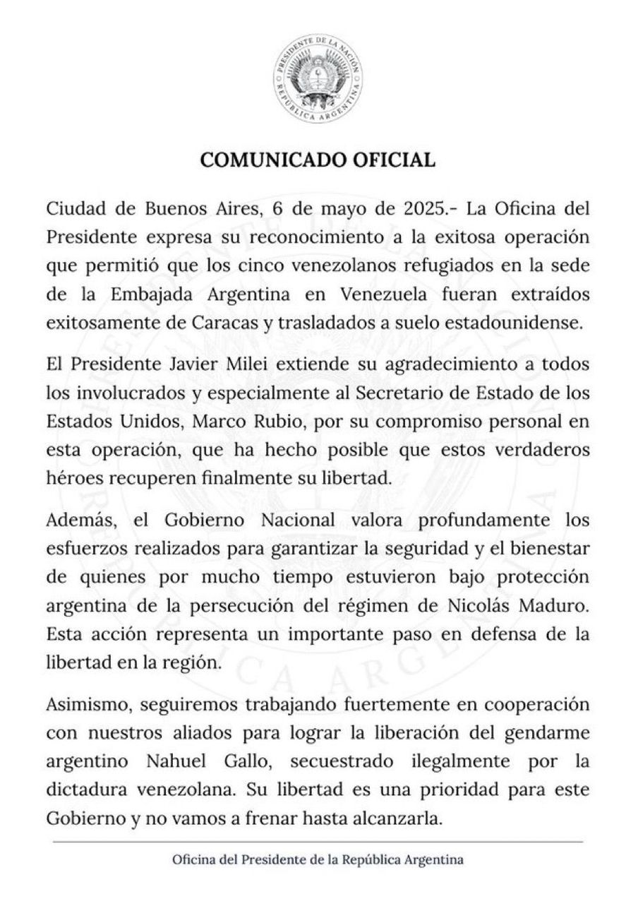 «El presidente Javier Milei extiende su agradecimiento a todos los involucrados y especialmente al secretario de Estado de los Estados Unidos, Marco Rubio, por su compromiso personal en esta operación, que ha hecho posible que estos verdaderos héroes recuperen finalmente su libertad», indicó su oficina presidencial.