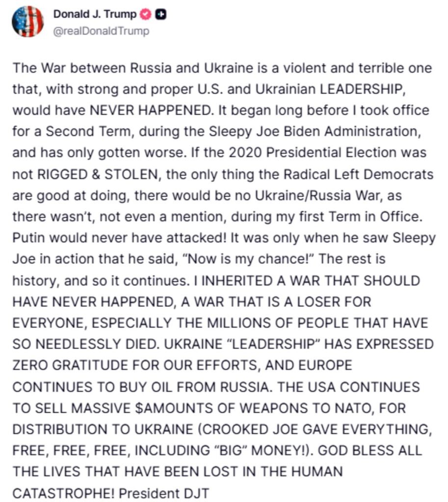 «La guerra entre Rusia y Ucrania es violenta y terrible, y con un liderazgo fuerte y adecuado tanto en Estados Unidos como en Ucrania, nunca habría ocurrido. Yo me llevaba bien con ambos países, pero luego Biden asumió el cargo para un segundo mandato, durante la administración de Joe Biden el dormilón, y todo ha empeorado. Si la elección presidencial de 2020 no hubiera sido amañada y robada —lo único en lo que los demócratas de izquierda radical son buenos— no habría guerra entre Ucrania y Rusia, como no la hubo, ni siquiera se mencionó, durante mi primer mandato en el cargo. Putin nunca habría atacado. Fue solo cuando vio en acción a Joe el dormilón que dijo: Ahora es mi oportunidad», escribió Trump en su red social, Truth.