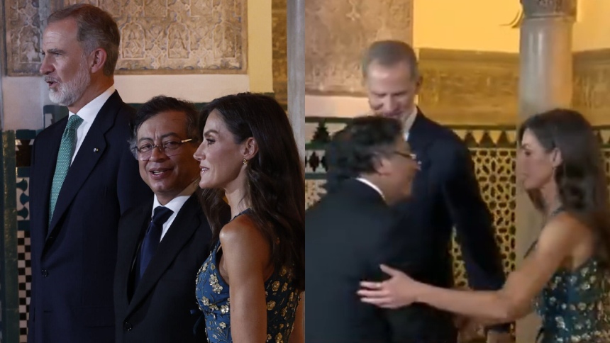 La reina española lo detuvo sutilmente y mantuvo la distancia, limitándose a estrechar la mano del mandatario colombiano. Luego Petro quedó en medio de los reyes para la fotografía oficial del encuentro.