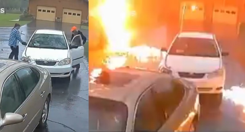 Las inquietantes imágenes muestran a un hombre y una mujer corriendo desde su casa hacia su vehículo en medio de una tormenta eléctrica repentina e intensa. Apenas dos segundos después de que cierran las puertas del auto, un potente rayo impacta violentamente el suelo a escasos metros del automóvil.