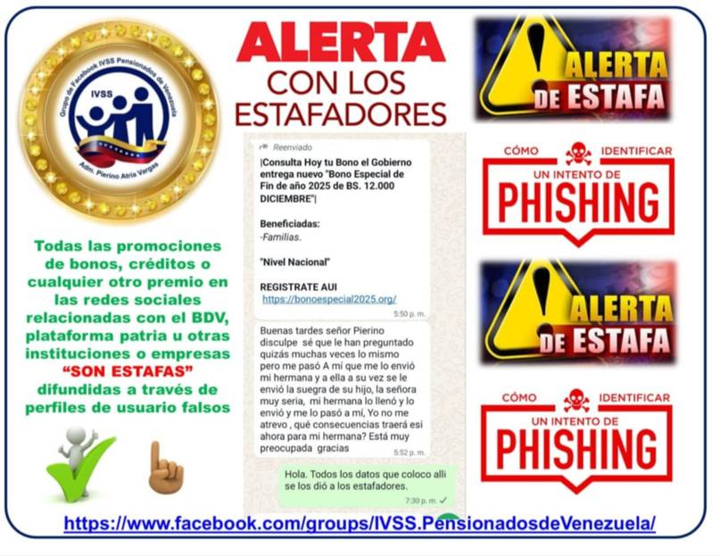 El grupo IVSS Pensionados de Venezuela advirtió a sus usuarios sobre una serie de estafas que se están llevando a cabo en redes sociales, presuntamente relacionadas con los bonos del Sistema Patria y otras aplicaciones como la plataforma del Banco de Venezuela (BDV).