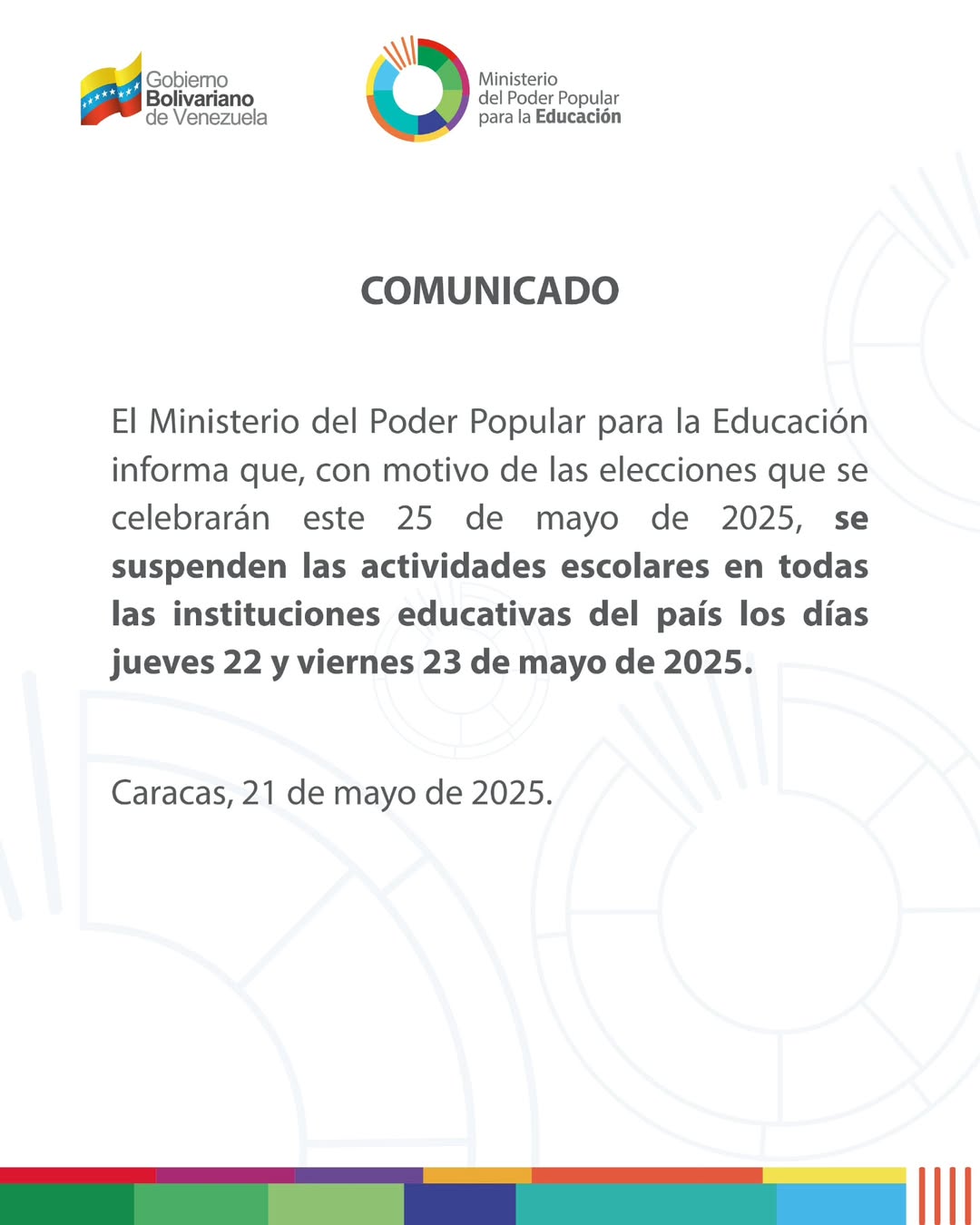 A través de un comunicado, la institución acotó que se suspenderán las actividades escolares los días jueves 22 y viernes 23 de mayo de 2025.