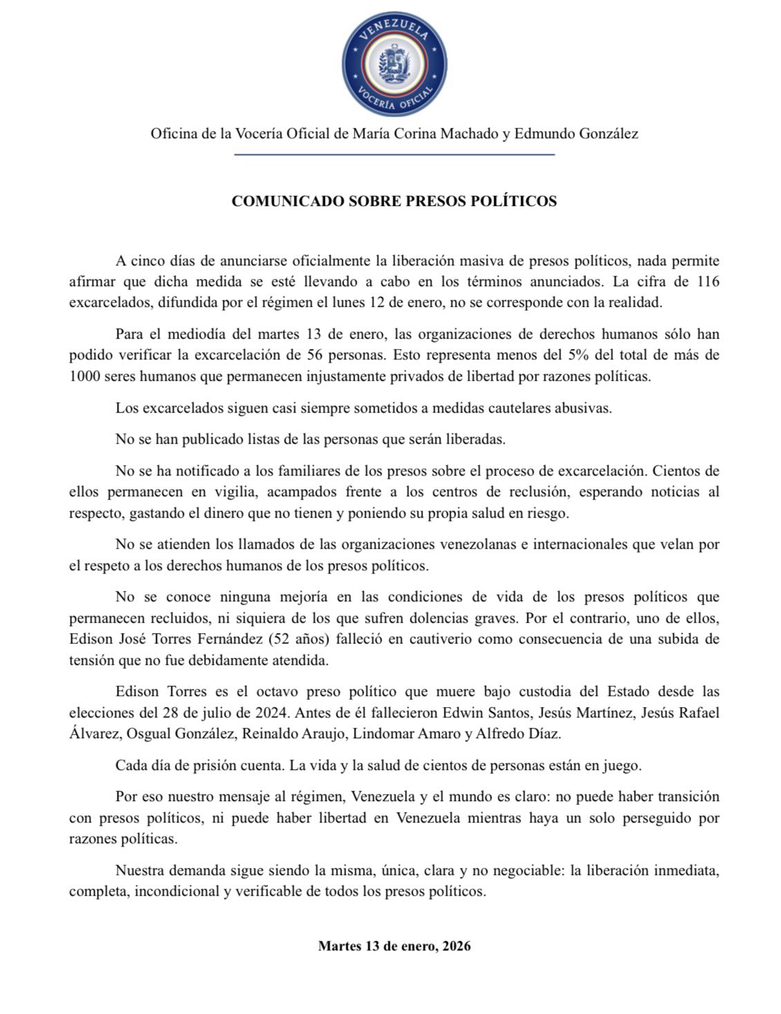 En ese sentido, recordaron que Edison Torres es el octavo preso político que muere bajo custodia del Estado desde las elecciones del 28 de julio de 2024.