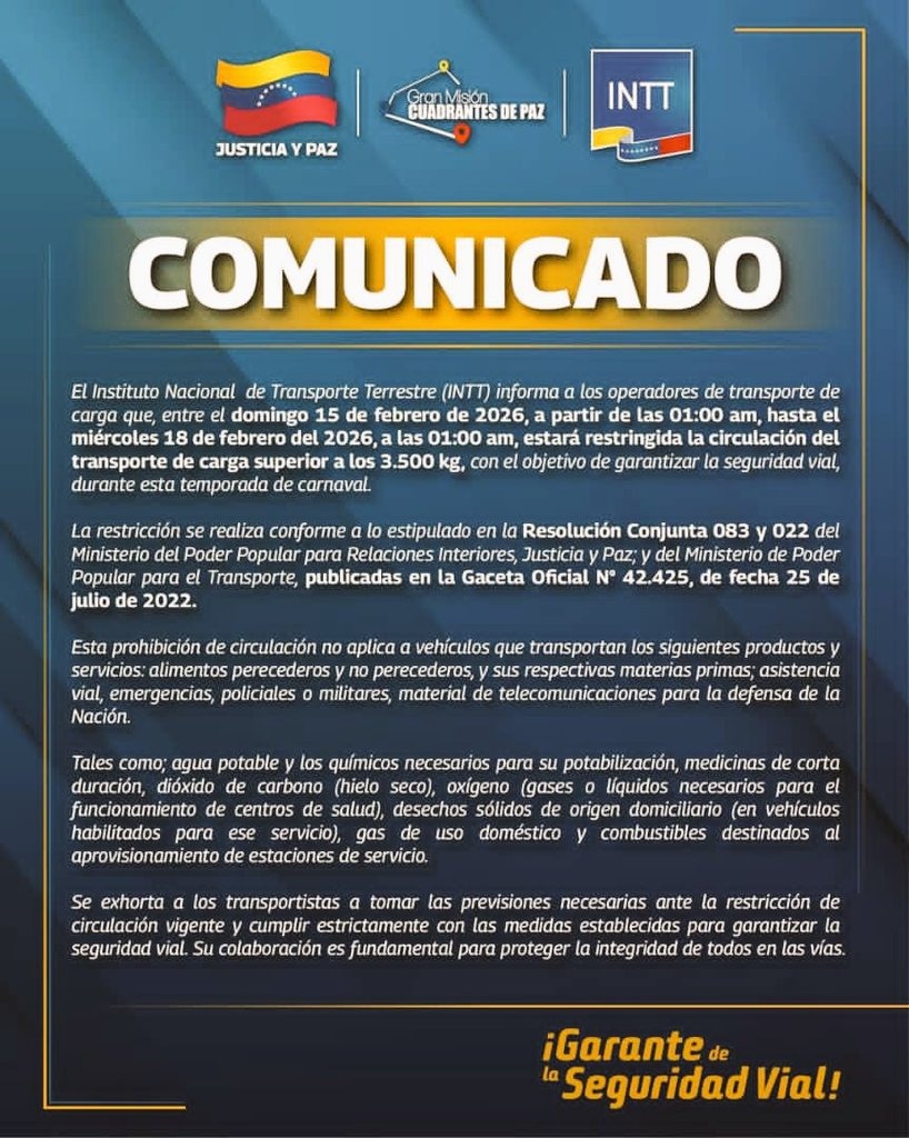 La restricción tiene el «objetivo de garantizar la seguridad vial, durante esta temporada de Carnaval». Igualmente, cabe destacar que el INTT establece algunas excepciones y algunos vehículos de carga pasada que sí podrán circular.