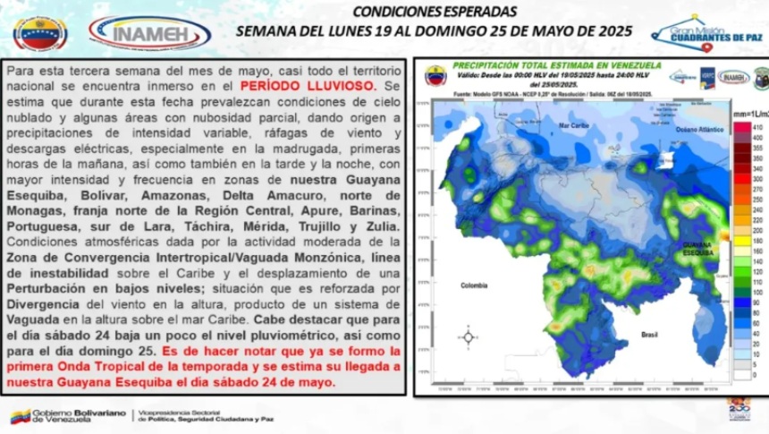 «Es de hacer notas que ya se formó la primera onda tropical de la temporada y se estima su llegada a nuestra Guayana Esequiba el sábado, 24 de mayo», indicó el Inameh, que no dio detalles de las zonas que serán afectadas por lluvias.