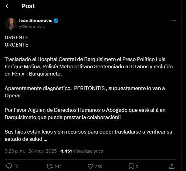 «Urgente: Trasladado al Hospital Central de Barquisimeto el preso político Luis Enrique Molina (…) Aparentemente diagnóstico: peritonitis, supuestamente lo van a operar. Por favor, alguien de derechos humanos o abogado que esté allá en Barquisimeto que pueda prestar la colaboración», escribió y publicó en X.