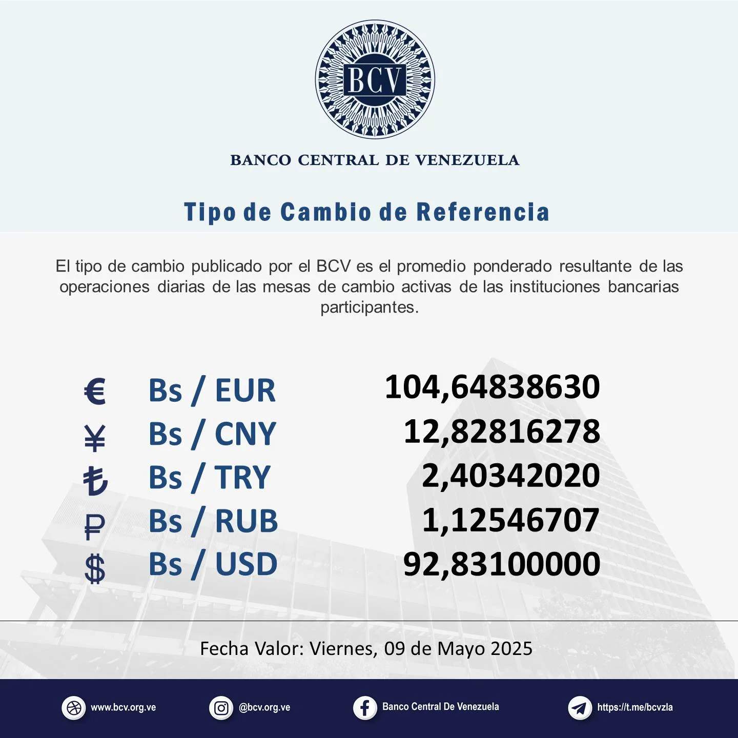 Entre tanto, el tipo de cambio oficial reportado por el Banco Central de Venezuela (BCV), se ubica para este viernes en Bs. 92,83. Además el euro tiene un valor de Bs. 104,65.