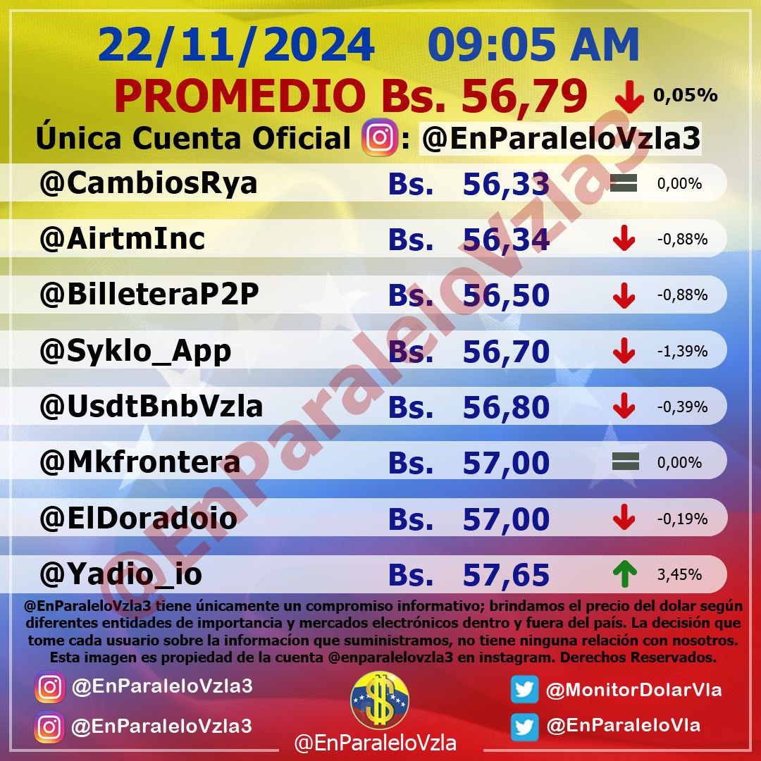 El dólar paralelo inició la jornada de este 22 de noviembre con tendencia a la baja al cotizarse en Bs. 56,79.