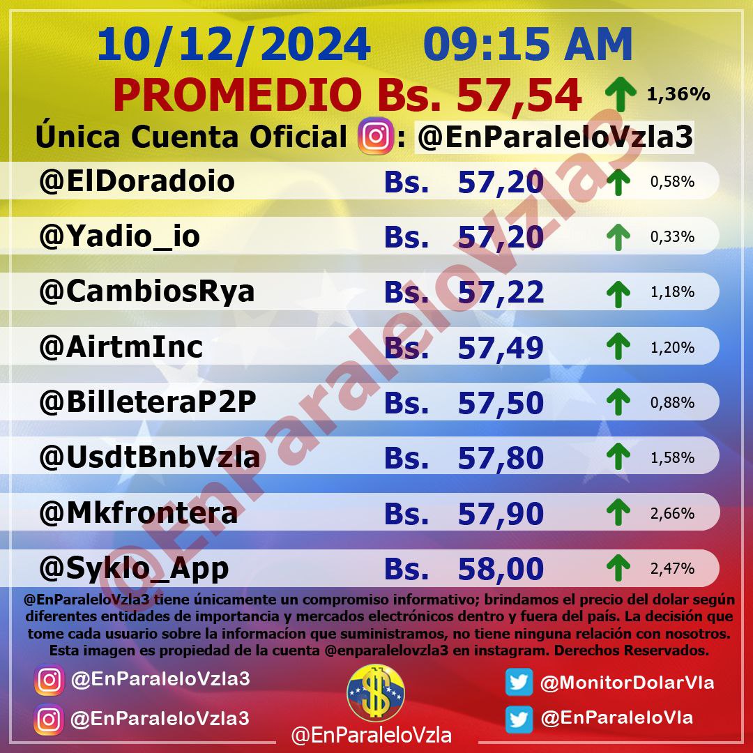 Las ocho cuentas que promedia este marcador del dólar paralelo (@UsdtBnbVzla, @AirtmInc, @CambiosRya, @Yadio_io, @Mkfrontera,@Syklo_App, @BilleteraP2P y @ElDoradoio) registraron comportamiento positivo al subir entre 0,33 % y 2,66 %.