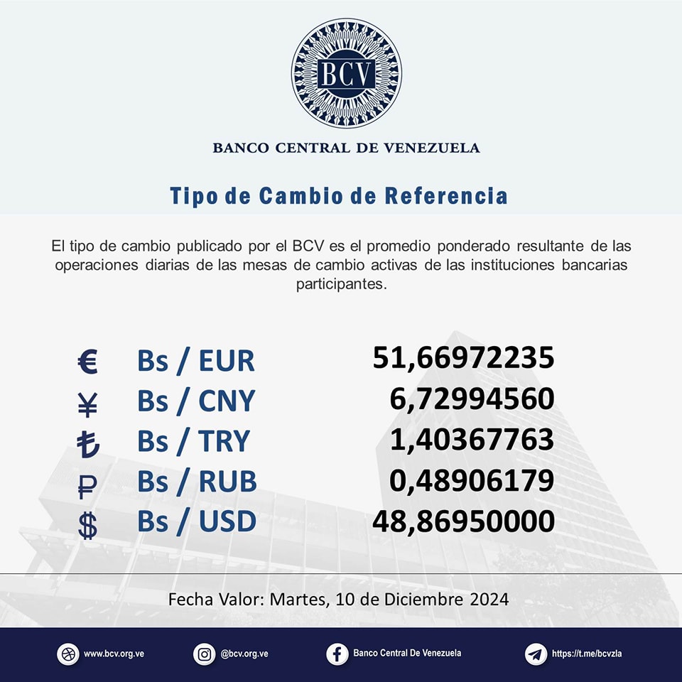Entre tanto, el tipo de cambio oficial reportado por el Banco Central de Venezuela (BCV), se ubica para este martes en Bs. 48,87. Además el euro tiene un valor de Bs. 51,67.