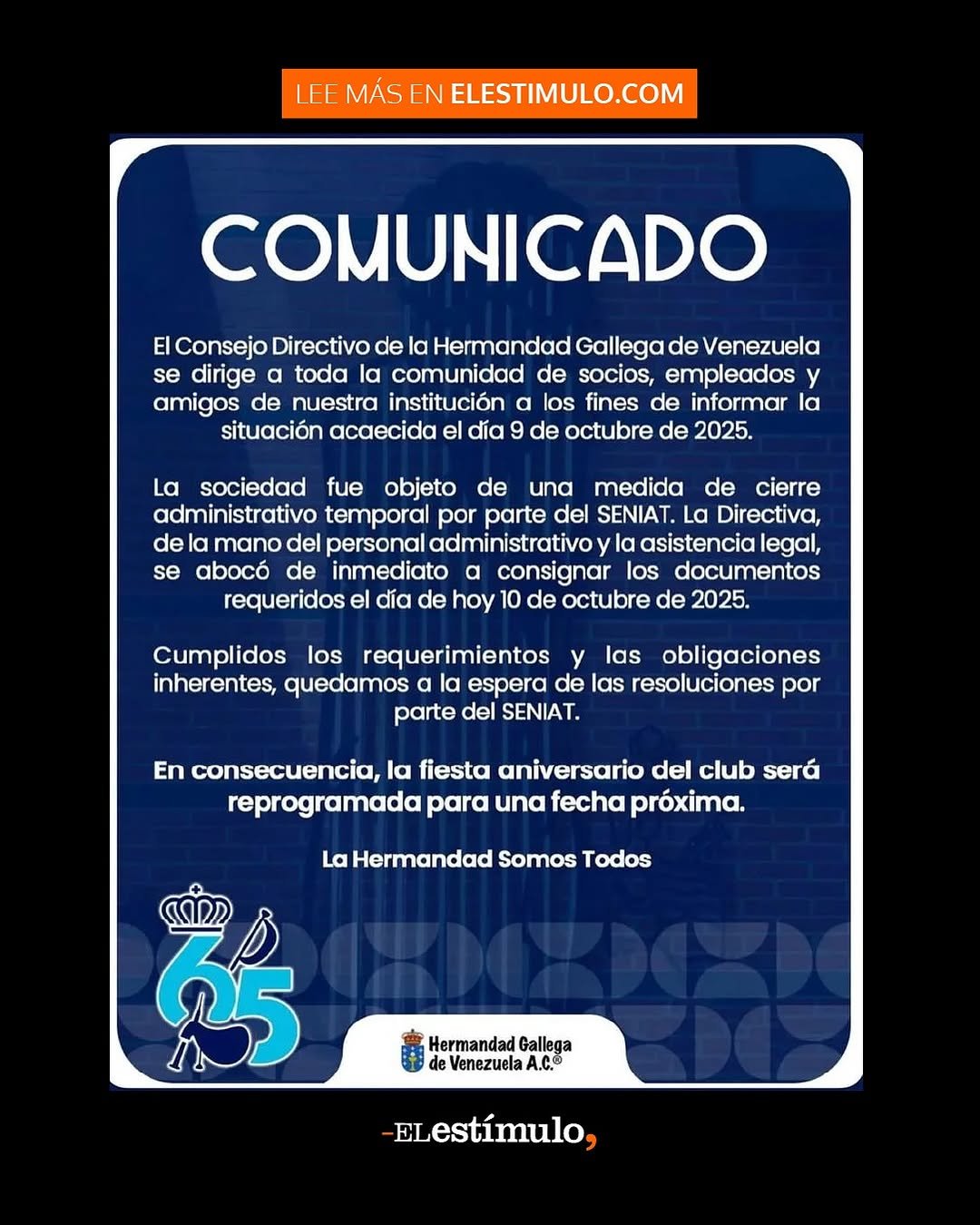 El Servicio Nacional de Administración Tributaria, Seniat, ordenó la clausura, por 12 días, de las dos sedes de la Hermandad Gallega de Caracas, su locación principal en Maripérez, y la de Valle Fresco, en Filas de Mariche.