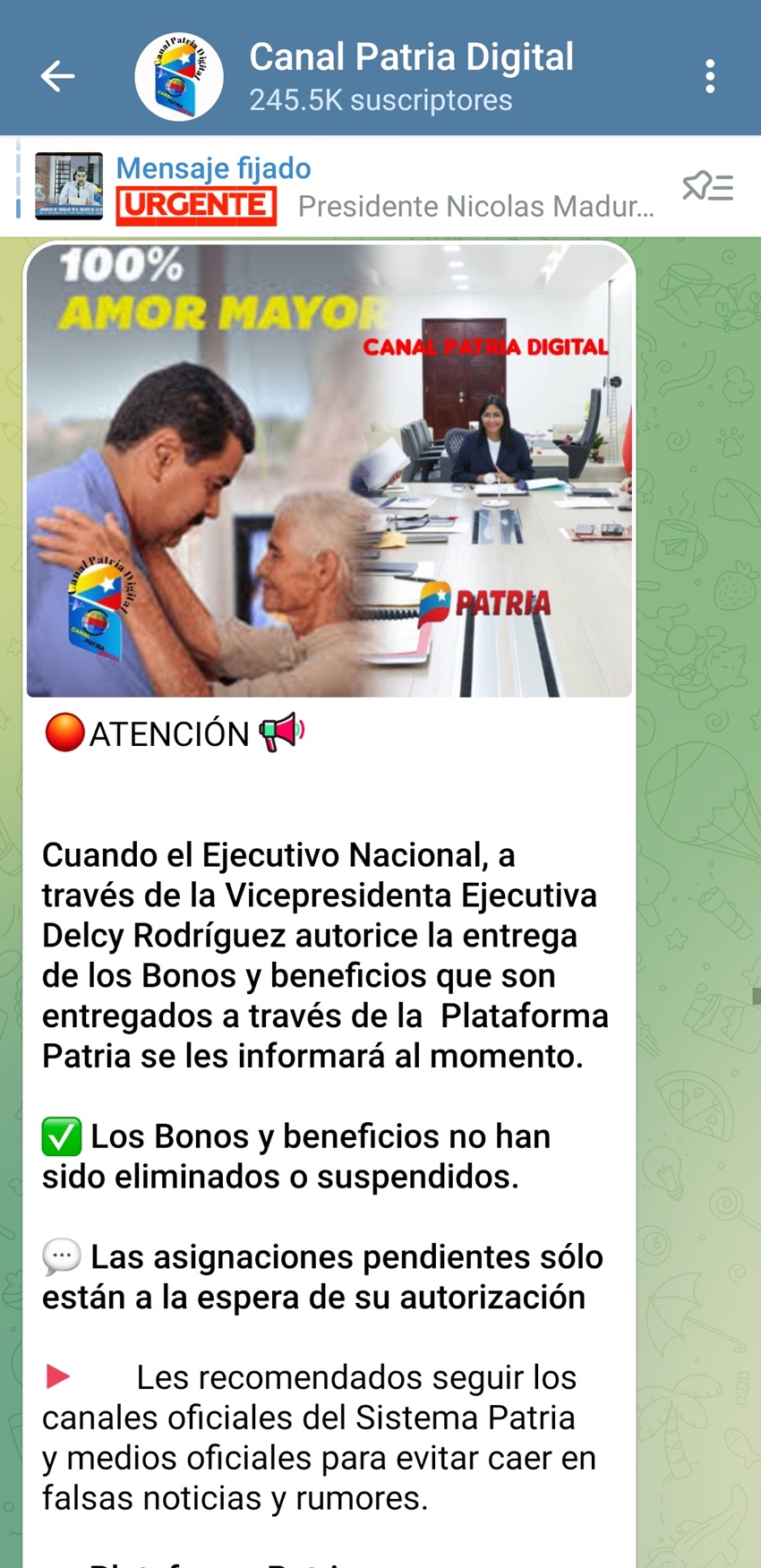 «Inicia la entrega del Bono de Corresponsabilidad y Formación, mayo 2025, a través de la Plataforma Patria para los trabajadores de la administración pública nómina especial», señaló el Canal Patria Digital a través de Telegram.
