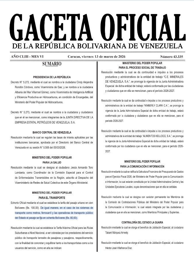 «Exhorto oficial mediante el cual se establece la tarifa del pasaje urbano en cien bolívares (Bs. 100,00)», dice la medida publicada en la Gaceta Oficial.