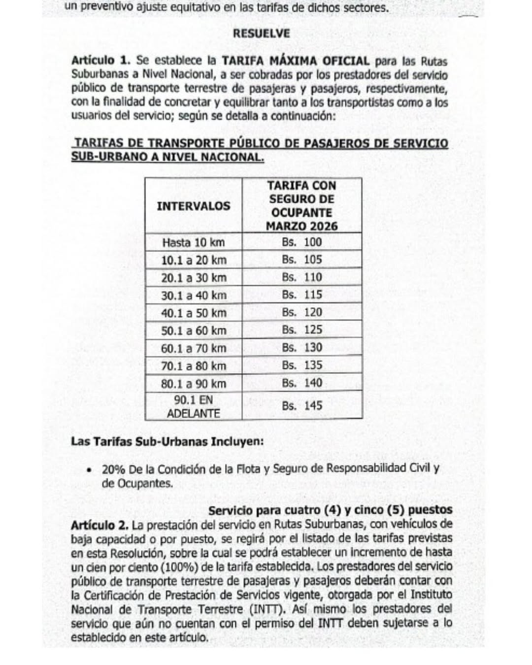 Asimismo, aclaró que el pasaje aumentará de acuerdo a la distancia que cubra la unidad de transporte en cuestión. Por lo que precisaron que en la resolución «se establece la tarifa máxima oficial para las rutas suburbanas a nivel nacional, a ser cobradas por los prestadores del servicio público de transporte terrestre de pasajeras y pasajeros, respectivamente, con la finalidad de concretar y equilibrar tanto a los transportistas como a los usuarios del servicio, como en ella se indican».