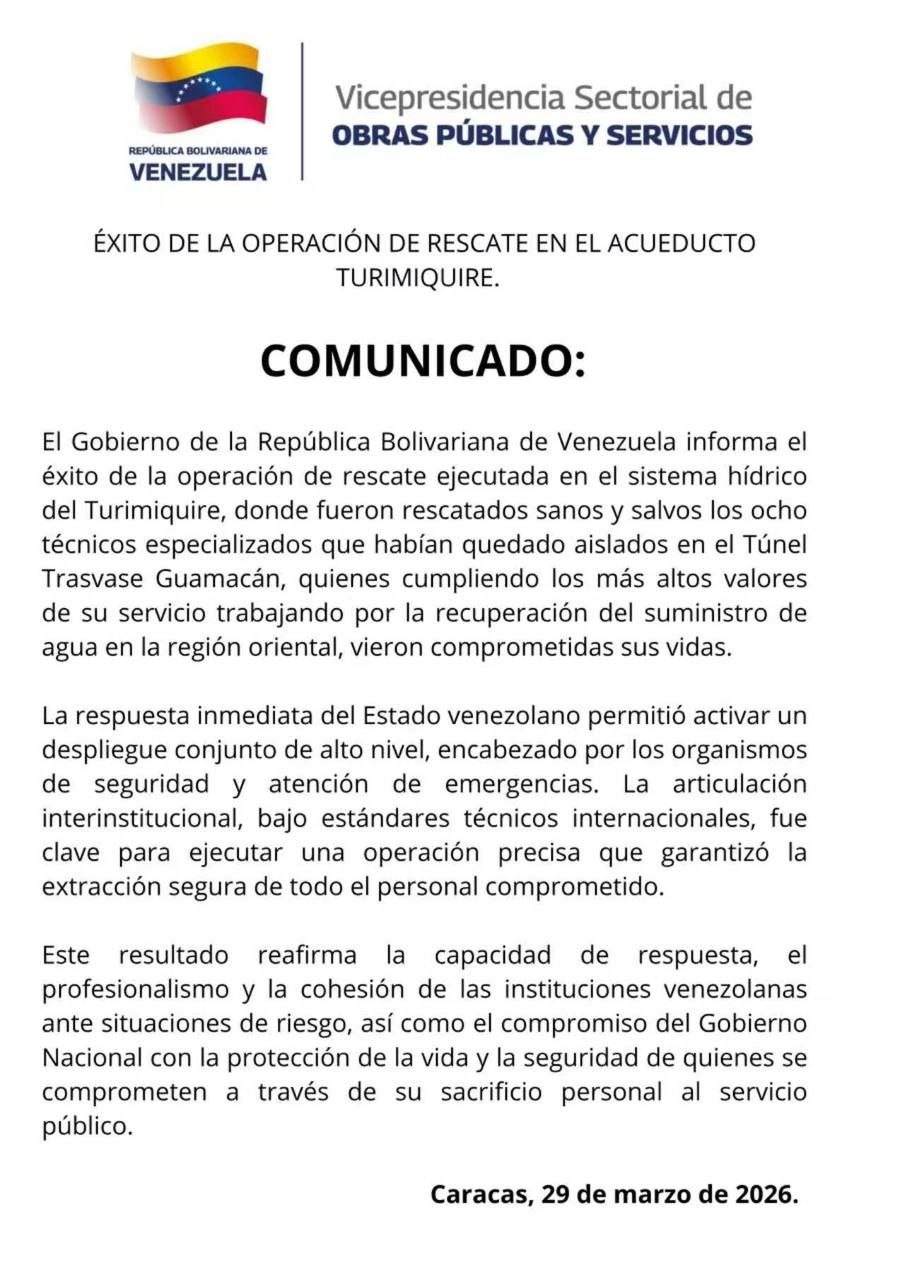 Tras horas de intensa incertidumbre y una operación de alta precisión técnica, las autoridades confirmaron este domingo el exitoso rescate de ocho técnicos especializados que habían quedado atrapados en el acueducto Turimiquire, que surte de agua al estado Sucre, partes de Nueva Esparta y algunos municipios de la zona norte de Anzoátegui.