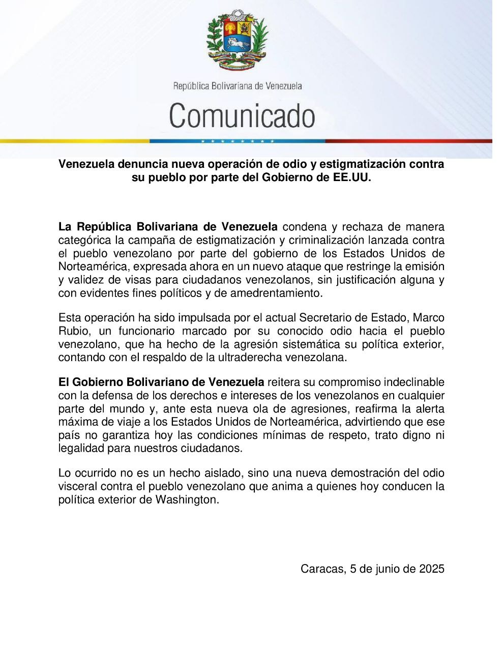 «Ante esta nueva ola de agresiones, reafirma la alerta máxima de viaje a los Estados Unidos de Norteamérica. Advirtiendo que ese país no garantiza hoy las condiciones mínimas de respeto, trato digno ni legalidad para nuestros ciudadanos. Lo ocurrido no es un hecho aislado, sino una nueva demostración del odio visceral contra el pueblo venezolano que anima a quienes hoy conducen la política exterior de Washington», sentenció.