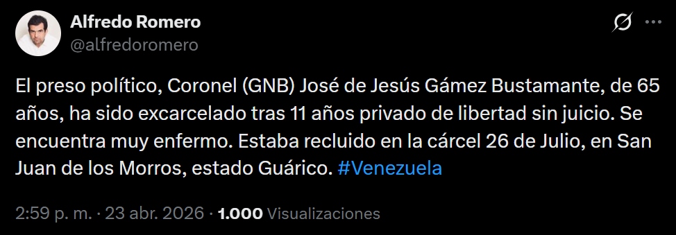 «Se encuentra muy enfermo. Estaba recluido en la cárcel 26 de Julio, en San Juan de los Morros, estado Guárico», detalló Romero en su cuenta de X (Twitter). Se desconoce si Gámez recibió libertad plena o fue excarcelado con medidas cautelares.